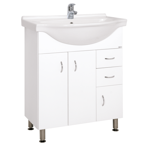 Álló fürdőszobaszekrény mosogatóval fehér színben fényes felülettel mérete 70,5x85x50,5 cm. Lakkozott felülettel.