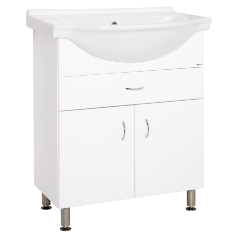 Álló fürdőszobaszekrény mosogatóval fehér színben fényes felülettel mérete 70x85x56 cm. Lakkozott felülettel.