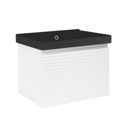 Felakasztható fürdőszobaszekrény kerámia mosdóval fehér színben fényes felülettel mérete 58x43x45 cm. A felület fólia kivitelben.