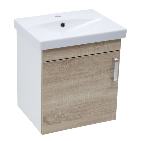Felakasztható fürdőszobaszekrény mosogatóval színes tölgy bardolino matt felülettel mérete 50x51x40 cm. A felület lamino kivitelben. Lassú záródással.