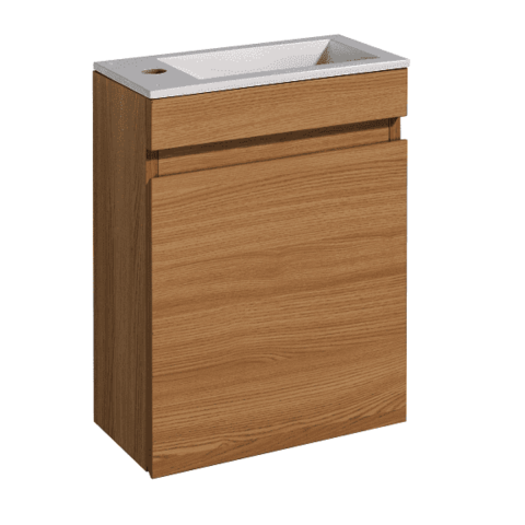 Világos fa szekrény mosogatóval, 40 cm széles és 22 cm mély, WC-hez vagy kis helyiségekhez alkalmas. Univerzális bal/jobb változat, a mosogató vagy az ajtó elfordításával.