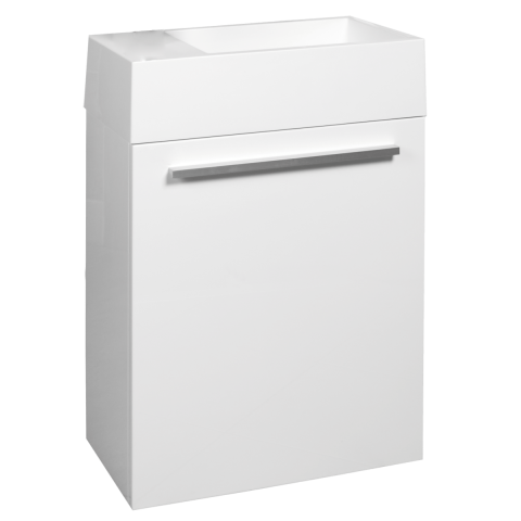 Felakasztható fürdőszobaszekrény mosogatóval fehér színben fényes felülettel mérete 46x63x26 cm. Lakkozott felülettel.