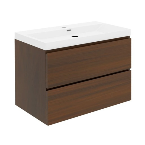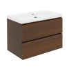 Felakasztható fürdőszobaszekrény kerámia mosdóval diófa dekorban matt felülettel mérete 79x30x45 cm. A felület lamino kivitelben.