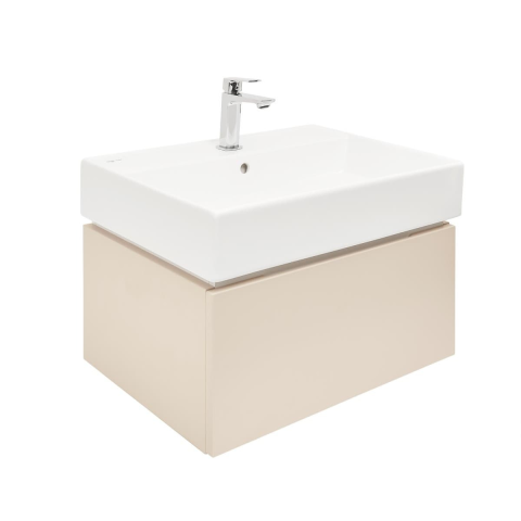 Felakasztható fürdőszobaszekrény kerámia mosdóval homok bézs színben matt felülettel mérete 60x30x46 cm. A felület lamino kivitelben.