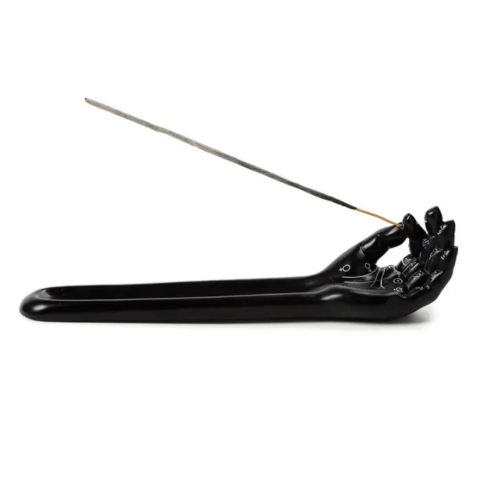 Vigyen egy csipetnyi misztikumot otthonába ezzel a stílusos, fekete gyantából készült füstölő tartóval, amely nyitott tenyér alakú. Tenyérjóslásra emlékeztető szimbólumokkal díszített Egyszerre praktikus és szimbolikus, így tökéletes spirituális gyakorlathoz vagy stílusos otthoni dekorációhoz.