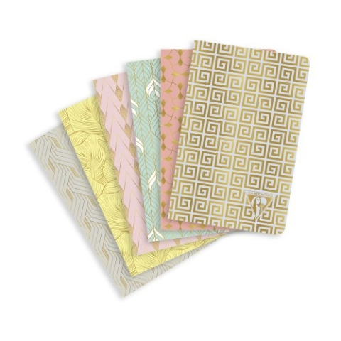 Füzet Clairefontaine Neo Deco Spring/Summer 9x14 cm 48 lapos vonalas, vegyes Méret: 9x14 cm48 laposKivitel: vonalasPuha fedelesMatt borítás, aranyszínű nyomatokkalGeometrikus és organikus minták egy kis arannyal fűszerezve, mely egyedi és elegáns megje