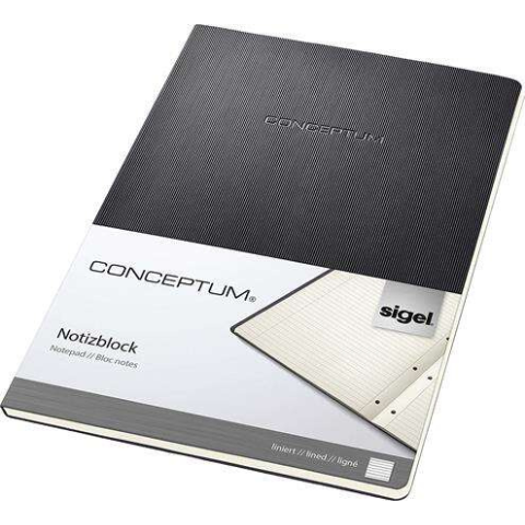 Füzet, exkluzív, A4, vonalas, 60 lap, keményfedeles, SIGEL Conceptum, fekete rugalmas, könnyen nyíló Softwave borítóval, kemény hátlappal, mely ideális támaszt nyújt írás közben tökéletes kötés és lyukasztott lapok a könnyed beillesztésért, belső zseb