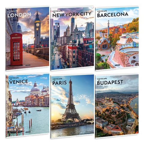 Füzet sima ARS UNA A/4 40 lapos Extra kapcsos Cityscape A/4-es méretű, prémium minőségű vonalas füzet. 40 lapos, belseje 75 gr-os, fehér papírból, minden oldala margózott. Borítója lekerekített sarkokkal, 350 gr-os fényes műnyomó kartonra, 4 szín nyomá