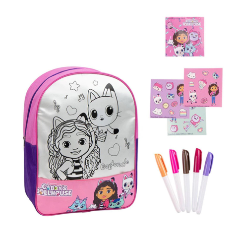 GABBY BABAHÁZA színezhető iskolatáska lányoknak 2700001824Engedd szabadjára gyermeked kreativitását ezzel a fantasztikus Gabby babaháza témájú hátizsák szettel! A hátizsák eleje kiszínezhető, így a gyerekek saját ízlésük szerint dekorálhatják kedvenc karaktereikkel díszített táskát.A szett tartalma:1 db rózsaszín-lila színű, kiszínezhető hátizsák (Gabby és cicafigurák nyomattal)4 db színes filctoll (narancssárga, barna, rózsaszín, lila)4 db matricalap G