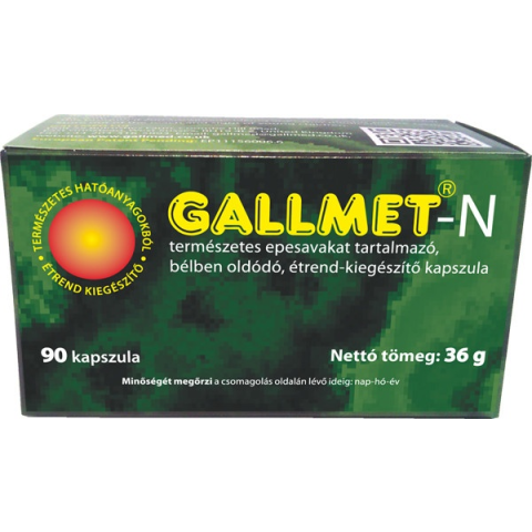GALLMET®-N természetes epesavakat tartalmazó, bélben oldódó étrend-kiegészítő kapszula Kiszerelés: 90 kapszula Nettó tömeg: 36 g Összetevők: szárított marhaepe; kapszula héj: hidoxi-propil-metil-cellulóz; tömegnövelő: mikrokristályos cellulóz; kapszul