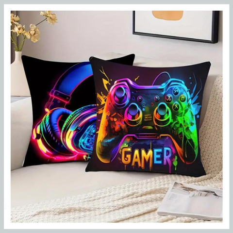 Gamer párnahuzat szett FU233604– stílusos kiegészítő játékosoknak- látványos gamer dizájn – Neon hatású kontroller és fejhallgató minták, amelyek feldobják a játékosok terét.- puha és tartós anyag – Kényelmes tapintású, légáteresztő és strapabíró szövetből készült.- univerzális méret – Kb. 45x45 cm-es méret, amely illeszkedik a legtöbb standard párnához.- dupla mintázat – Két különböző dizájn egy szettben, hogy variálható legyen a dekor