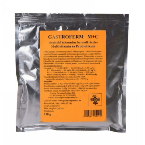 Gastroferm M+C 100 gPre- és probiotikumA Gastroferm M+C egy probiotikum és multivitamin tartalmú készítmény, amely kevert tejsavtermelő kultúrát, vitamin premixet és 4% C-vitamint tartalmaz, száraz és nedves takarmányba keverhető és ivóvízben is oldható f
