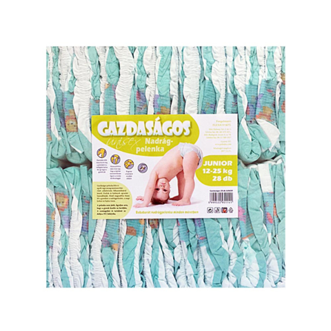 Gazdaságos pelenka 28db junior 12-25kg Jó minõségû, nagy kiszerelésû, tépõzáras nadrágpelenka, változatos, vidám mintákkal. A pelenkázás könnyû és gazdaságos, mivel az ára olcsó, megfizethetõ. Textiles borítású, légáteresztõs, tépõzáras, többször nyith