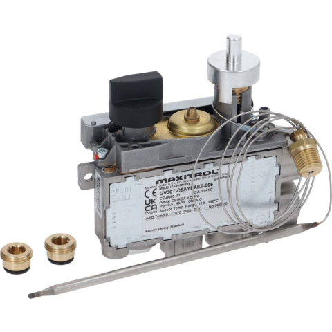 modell GV30T-C5AYEAK0-006 | bemenet ø 3/8 'F - kimenet ø 3/8 'F | termopár csatlakozás M9x1 | max. gázbemeneti nyomás 50 mbar | kapilláris hossz 720 mm | tömszelence csatlakozás M8x1 | tartály tömítő csatlakozás ø 1/4' | izzó ø 5x160 mm | D-alakú tüske 8x