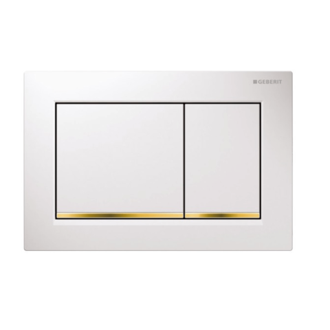 A jól ismert GEBERIT cég által tervezett Omega30 kettős működésű vezérlőgomb fehér/arany színben a Geberit Omega rejtett tartályok öblítésének vezérlésére, felső vagy elülső működtetésre, a gombrudak hangszigeteltek, gyors és szerszám nélküli beállítás, így minden fürdőszobába megfelelő választás. A gomb csak a Geberit Omega modulokkal kompatibilis, a Geberit Sigma és Delta modulokkal nem kompatibilis.