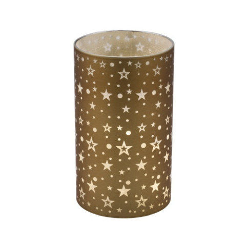 A(z) Aranyszínű üveghenger LED-es, átvilágítós, csillagos, 9x9x15cm egy stílusos és igényes darab üveg anyagból készült , mérete: 9x9x15cm . A termék a(z) Gehlmann márka kínálatából származik , eredeti származási helye: Németország.