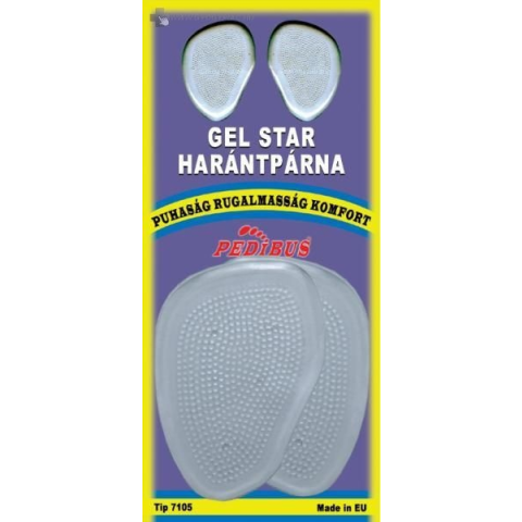 Gel Star, kényelmes harántpárna, mely puha gél anyagból készült. A gél megelőzi a láb nemkívánatos előre csúszását a cipőben. Kellemesen alápárnázza és védi a harántcsontozatot. A hátoldalon található fóliát húzza le és helyezze a cipőben. Öntapadós. Mér