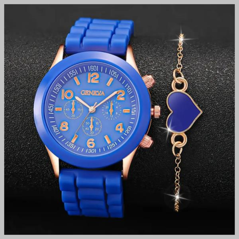 Geneva Női karóra és karlánc ajándékszett kék MM721730-KElegáns ajándékkészlet – szilikon szíjas kvarc karóra világtérképes számlappal és szív alakú karkötővel – nőies kiegészítő hétköznapokra és különleges alkalmakraLepd meg szeretteidet egy stílusos és praktikus ajándékkal! Ez az elegáns női ajándékszett egy modern kialakítású, világtérképes számlappal ellátott kvarc karórát, valamint egy finoman megmunkált, szív alakú díszítésű kark