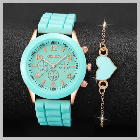 Geneva Női karóra és karlánc ajándékszett kék MM721730-TElegáns ajándékkészlet – szilikon szíjas kvarc karóra világtérképes számlappal és szív alakú karkötővel – nőies kiegészítő hétköznapokra és különleges alkalmakraLepd meg szeretteidet egy stílusos és praktikus ajándékkal! Ez az elegáns női ajándékszett egy modern kialakítású, világtérképes számlappal ellátott kvarc karórát, valamint egy finoman megmunkált, szív alakú díszítésű kark