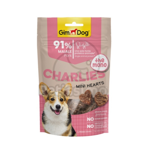 1 kép GimDog Charlies The Mono Mini Hearts jutalomfalat - sertés, szív alakú 70 g
