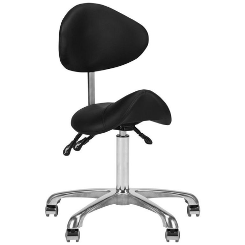 A kényelmes és stabil kozmetikai szék, háttámlával, ötágú stabil alapzattal és gumírozott kerekekkel, alkalmas szépség- és tetováló szalonokba egyaránt.