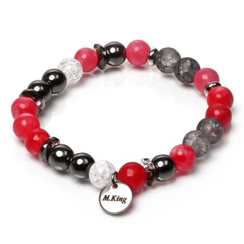 RUGALMAS KARKÖTŐ, a mérete választható. Az ékszer ásványai és tartozékai: – 8 mm-es fekete hematit gyöngyök – 8 mm-es szürke és fehér roppantott hegyikristály gyöngyök – 8 mm-es malajziai pink jade gyöngyök – 8 mm-es fekete