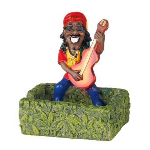 Ez a négyszögletes, polirezinből és kerámiából készült hamutartó vidám dísze lehet akár egy baráti időtöltésnek is. A vidáman gitározó rasta figura előtt 2 szál cigarettának van helye a hamutartóban, melynek oldalát cannabis levelek díszítik. A 8.5 cm széles, figurával együtt 9 cm magas hamutartó azonnal szemet szúr szokatlan, vidám kialakításával. Súly: 172 g