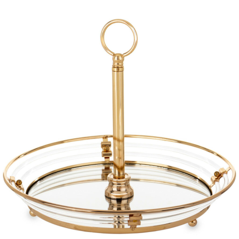 1 kép Glamour design kecses kerek sárgaarany fém kínálótálca lábakon üvegfelülettel és fogantyúval 32x26x26cm