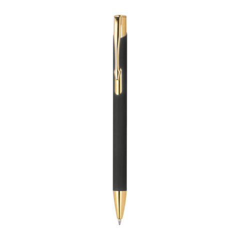 Alumíniumból készült golyóstoll arany színű kiegészítőkkel, gumírozott felülettel és nagy kapacitású kéken író tollbetéttel. A gumírozott felület gravírozás után elegáns, aranyszínű logóképet eredményez