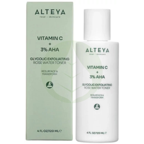 Glikolsav hámlasztó arctonik (C-vitamin + 3% AHA) - 120ml - Alteya Organics Ez a mindennapos használatra tervezett hámlasztó tonik gyengéden megújítja a bőrt és láthatóan kisimítja a durva textúrát irritáció nélkül, melytől a bőr ragyogóbbá és egyenletes