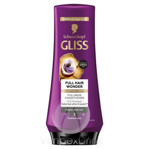 Gliss Full Hair Wonder dúsító hajbalzsam koffeinnel + peptidekkel, töredező és gyenge hajra. Simítja és ápolja a gyenge, töredezett hajat, miközben tökéletes kifésülhetőséget és dúsabb hajat eredményez*. Gliss Ápolási Skála 2-es fokozat: Közepes er