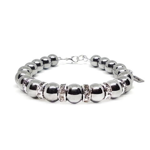 Figyelem! Nem szakad, nem nyúlik! Tartós ékszer. Az ékszer ásványai és tartozékai: – 8 mm-es festett ezüst színű hematit ásványok – Ezüst-fehér köves strasszos díszek – M.King márkajelzésű nemesacél logóbiléta a csatnál – Z