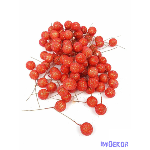 Glitteres drótos 1,5cm bogyó kb 80db/csomag - Piros dekorációs kellék 1 kép