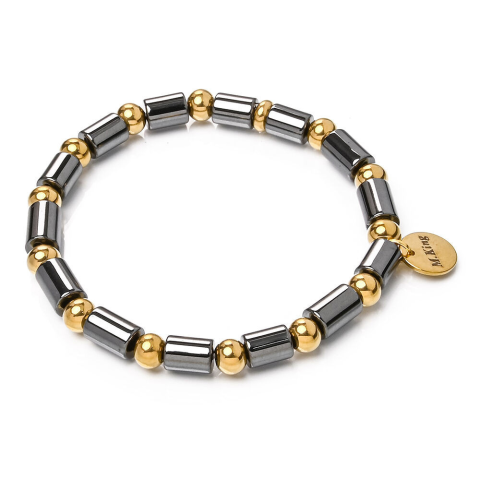 RUGALMAS KARKÖTŐ, a mérete választható.Az ékszer ásványai és tartozékai:– 6x8 mm-es fekete hematit henger gyöngyök– Arany színű fém díszek– M.King márkajelzésű nemesacél logóbiléta a csatnál– Technika: rugalmas, tartós