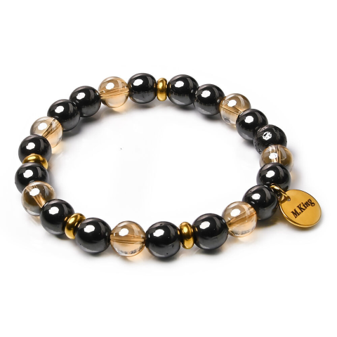 RUGALMAS KARKÖTŐ, a mérete választható. Az ékszer ásványai és tartozékai:– 8 mm-es fekete hematit gyöngyök– 8 mm-es arany angyal aura gyöngyök– Arany színű díszek– M.King márkajelzésű nemesacél logóbiléta a csatnál–