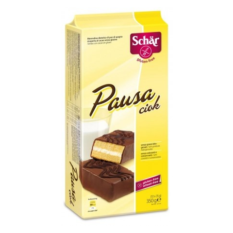 Schär gluténmentes Pausa Ciok piskótaszelet. Lágy piskóta tejkrémes töltelékkel és kakaós bevonattal. Minden korosztály kedvence lehet, igazi ínyencség édesszájúaknak.Összetevők Cukor, növényi zsír és olaj változó arányban (magas olajsavtartalmú napra