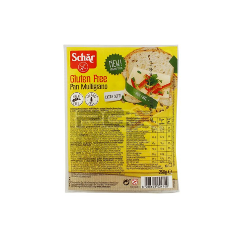 Pan Multigrano szeletelt, magvas kenyér lenmaggal, napraforgómaggal és kölesmaggal. Összetétel: víz, kukorica keményítő, rizsliszt, növényi olaj, lenmag, hidroxipropil metilén cellulóz, napraforgó olaj, szója fehérje, napraforgó mag, élesztó, só, cuko