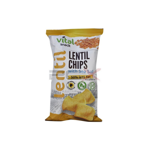 Vital Lencse chips - tengeri sós ízű.81%-ban tartalmaz BIO összetevőket. A termék 50%-kal kevesebb zsírt tartalmaz, mint a hagyományos burgonya chips. Gluténmentes termék. Összetevők: BIO lencseliszt (36%), BIO burgonyakeményítő, napraforgóolaj, BIO