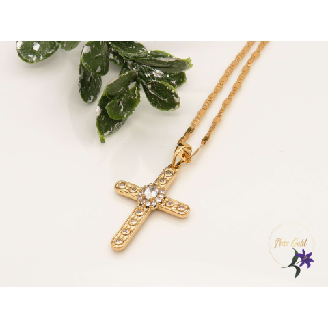 Goldfilled kereszt medál apró cirkóna kövekkel fehér központi kővel lapos váltott szemes nyaklánc jár hozzá Szin: 18K Méret: 50 cm / 2mm Medál: 34x20 mm