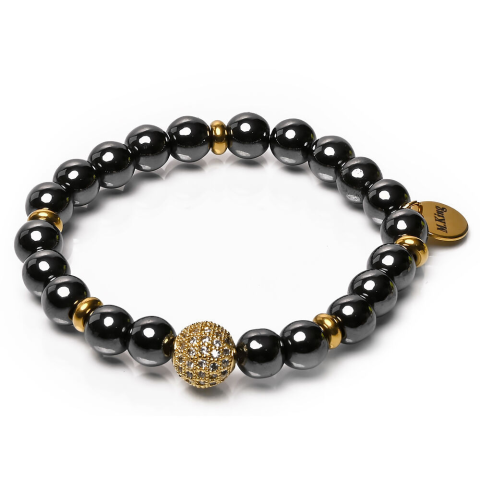 RUGALMAS KARKÖTŐ, a mérete választható.Az ékszer ásványai és tartozékai:– 8 mm-es fekete-metál festett Hematit ásványok–10 mm-es arany-fekete strasszos pavé dísz – Arany színű díszek– M.King márkajelzésű nemesacél logóbilé