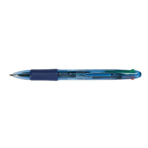 Q-CONNECT 4 színű golyóstoll átlátszó kék, klipszes tolltesttel, gumírozott fogórésszel. Kék, fekete, piros, zöld színű tintával. A tollbetét nem cserélhető.