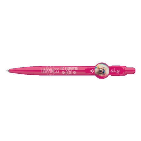 Golyóstoll ICO dogs pink Kutyás motívumokkal díszített nyomógombos mechanikával működő golyóstoll 0,8 mm-es kék színű golyósbetéttel.