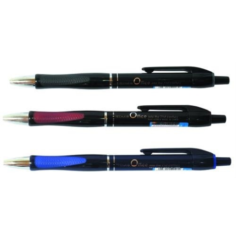 Műanyag, gumis fogós, nyomógombos golyóstoll. Cserélhető betétes: X-18
