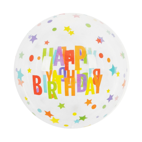 50 cm átmérőjű, gömb alakú buborék lufi Happy Birthday felirattal, mely egy születésnapi party igazán látványos dekorációs kelléke lehet. A buborék lufik különlegessége, hogy majdnem szabályos gömb alakúak és egy különleges celofánhatású műanyagból készül