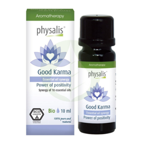 Good Karma illóolaj-keverék - bio - 10ml - Physalis Engedje szabadon áramlani a pozitív eneregiát a Physalis Good Karma-val, ami egy 10 illóolajból álló keverék. Tartalmaz többek között gerániumot, petitgraint, pálmarózsát, ylang-ylang-ot, bergamottot és