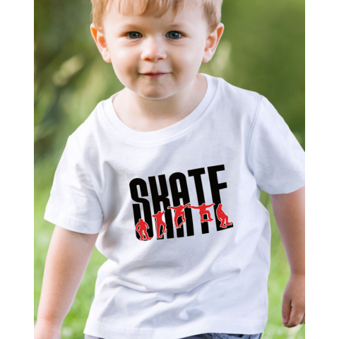 Gördeszkás gyerek póló, Skate. Skate feliratos, gördeszkás mintás gyerek póló, a gördeszkás életérzés minden napra! Mutasd meg a gördeszkás stílusodat ezzel a Skate feliratos, gördeszkás mintás pólóval! Egyedi designjának és kényelmes anyagának köszönhető