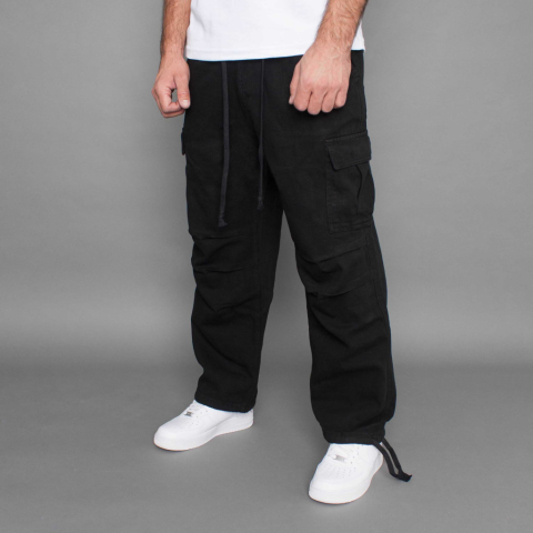 Baggy Fit, bő fazonú, fekete színű oldalzsebes nadrág, gumis derékkal és húzózsinórral, bokánál szűkíthető kötővel Modell: 185 cm/ 85 kg/ M-es méret