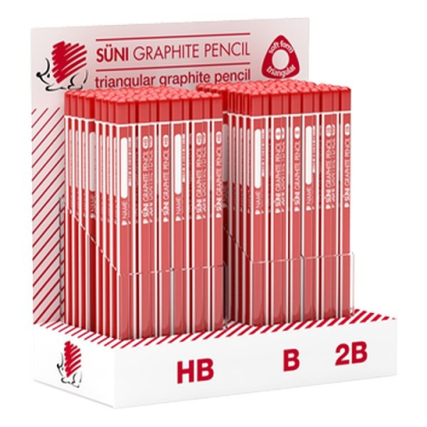 Grafitceruza display ICO Süni háromszög HB,B,2B 184 darabos Háromszögletű grafitceruza, HB,B,2B keménység, csíkos ceruzatest. A display tartalma: 92 db HB, 46 db B, 46 db 2B ceruza.