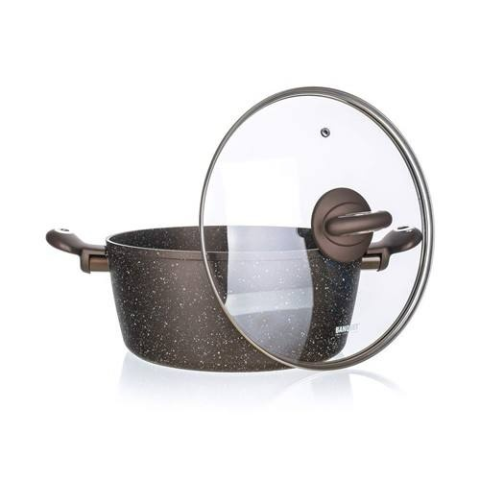 Kovácsolt alumínium öntvény fazék üvegfedővel, PREMIUM DARK BROWN tapadásmentes bevonattal, méret 24 x 10,5 cm, barna gránit minta, falvastagság 3 mm, teljesen indukciós talp, soft-touch nyél és fogantyú. A tapadásmentes bevonat rendkívül kemény és karcálló. A fazék ütésálló és formatartó.