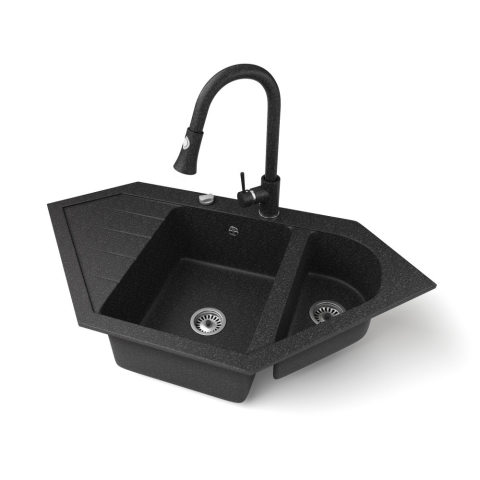 NERO Joker sarok mosogató, ami egyben praktikus és impozáns látványelem is a konyhában. Tökéletes választás azokba a konyhákba, ahol a mosogató rész a sarokban lett kialakítva. Szögletes, határozott vonalvezetése nagyszerűen illik modern vagy minimál stíl